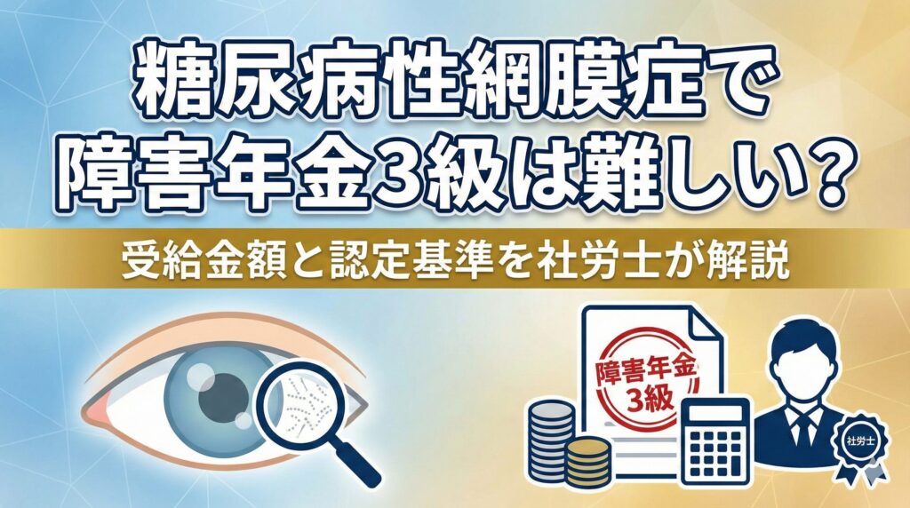 糖尿病性網膜症により視力が低下し、仕事や日常生活に支障が出ている方にとって、障害年金は重要な経済的支援となります。特に「障害厚生年金3級」は、働きながらでも受給できる可能性があり、最低でも年額62万3,800円(月額約5万2,000円)が保障されていま… -