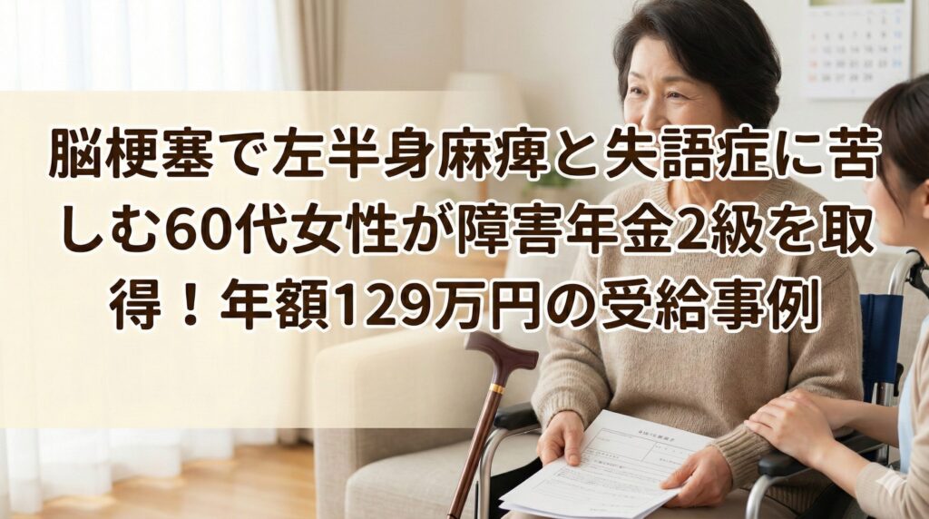 脳梗塞で左半身麻痺と失語症に苦しむ60代女性が障害年金2級を取得!年額129万円の受給事例